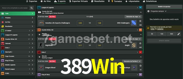 O 389Win oferece uma grande seleção de opções de apostas em e-sports com probabilidades competitivas